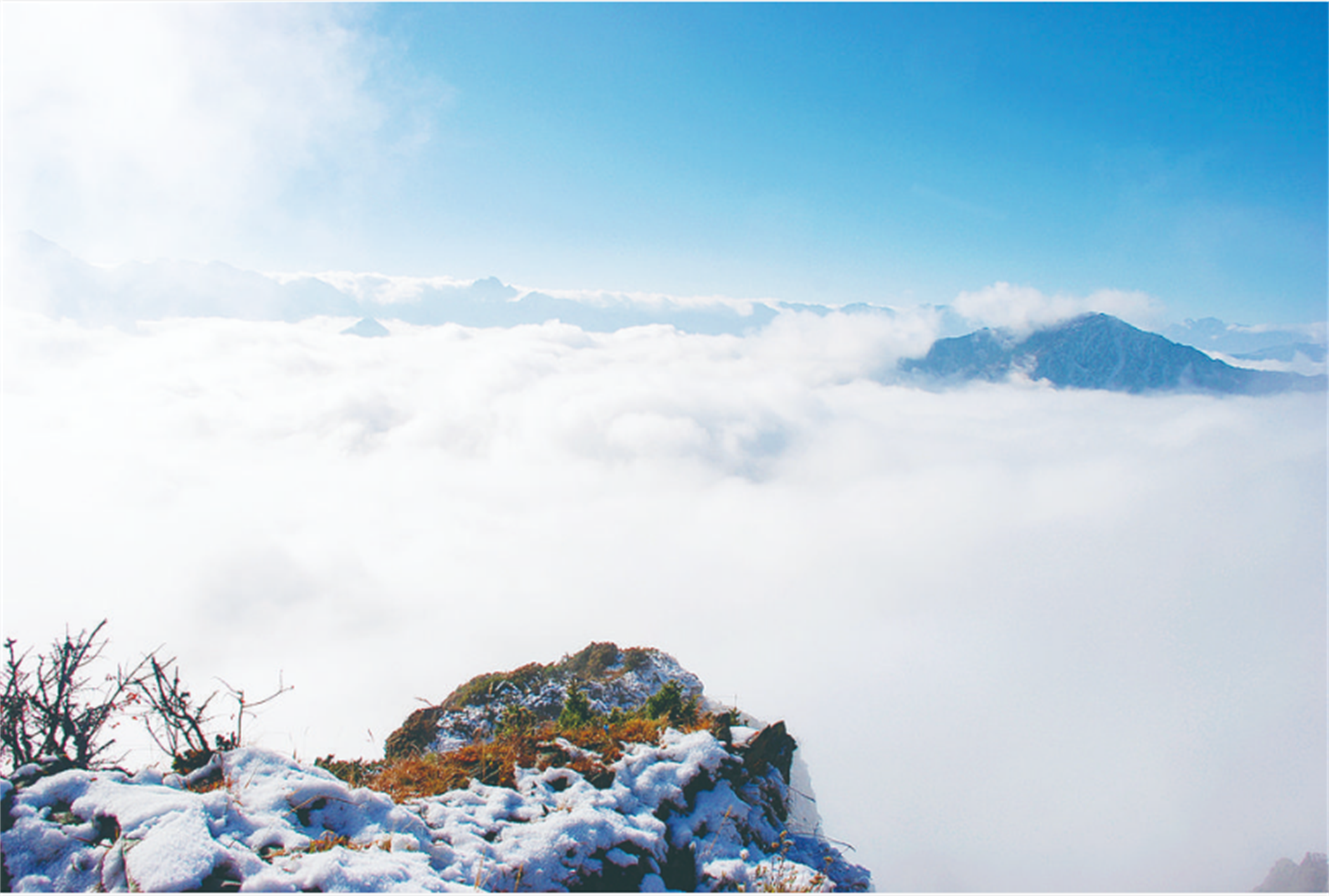 春日,山間植被還未青翠,雪山還未融化,山巒疊嶂在云海上,雪的白與云的白交相輝映。待到云開時(shí),山腰霧凇呈現(xiàn)出“忽如一夜春風(fēng)來(lái),千樹萬(wàn)樹梨花開”的自然奇觀。