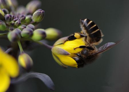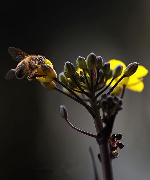 千百年來(lái),許多小宗蔬菜的傳宗接代依靠中華蜜蜂授粉。紫油菜花在初春開(kāi)放,這個(gè)季節(jié)西方蜜蜂因畏寒仍在巢中被人工飼養(yǎng),只有中華蜜蜂不怕寒冷,不嫌花源稀少,只要?dú)鉁剡_(dá)到8℃,它們就出勤了。 熊小立圖文 攝于成都