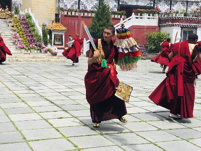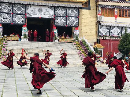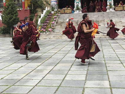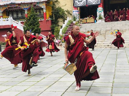 跳神儀式開始,南無寺內(nèi)鼓號(hào)齊鳴,喇嘛身著顯耀盛裝,點(diǎn)燃新綠松枝,幾縷藍(lán)色煙紋升起。一支由法鼓、鈸、海螺、法號(hào)等組成的寺廟樂隊(duì)自大殿而出,順時(shí)針繞場(chǎng)一周落座場(chǎng)邊,群神出場(chǎng)繞圈而舞,以示凈化場(chǎng)地,祈請(qǐng)諸神入位。接著,象征護(hù)法神舞、骷髏舞、鹿神舞、黑帽咒師舞和金剛力士舞的演員手持各類法器挨個(gè)入場(chǎng)手舞足蹈。舞蹈的起落根 據(jù)場(chǎng)邊奏響的器樂節(jié)奏進(jìn)行。最后由眾神驅(qū)鬼逐邪,押送“朵馬”(由糌粑捏成用以供神施鬼的食品)至寺外拋丟焚燒,以示驅(qū)逐一年的邪魔,祈禱來年安樂。