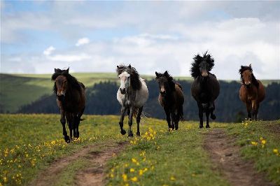 8月5日,在雅江縣西俄洛鎮(zhèn)郭崗頂,幾匹駿馬奔馳在草原上。