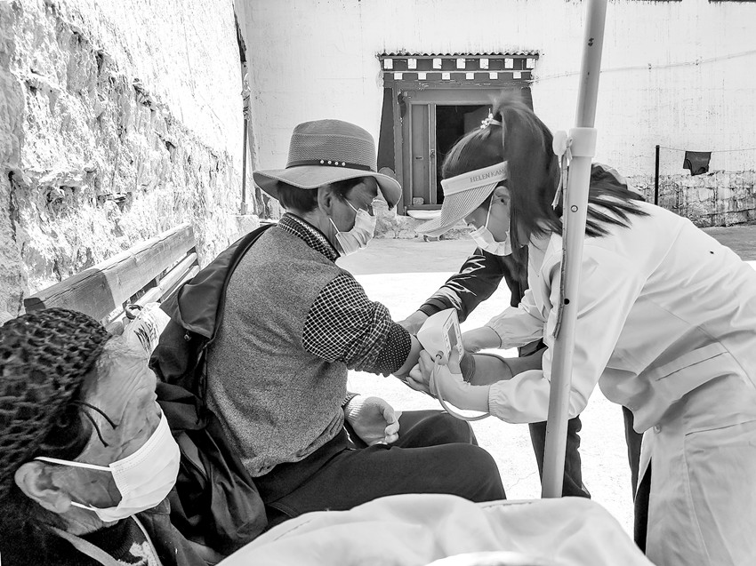 圖為入戶開展腫瘤防治宣傳時(shí)醫(yī)護(hù)人員提供免費(fèi)量血壓服務(wù)。