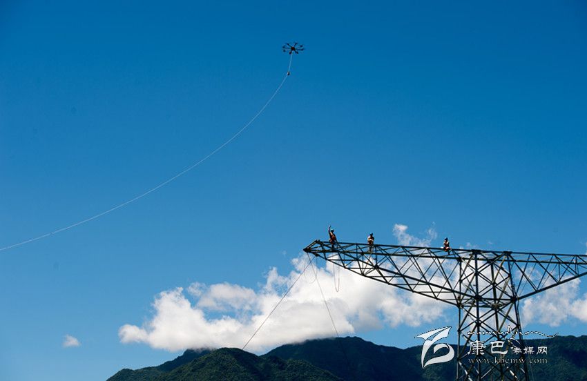 酒泉—湖南電力線路是我國目前輸電距離最長的±800千伏特高壓輸電工程,全長2383公里、投資262億元,預計于2017年2月建成投運。酒湖線重慶巫溪段共110基輸電鐵塔,70%位于山脊,93.6%的建造需要架設(shè)專用運輸索道。 圖為7月15日,掛載著第一級牽引導線的放線無人機在空中懸停配合高空作業(yè)人員完成架線作業(yè)。