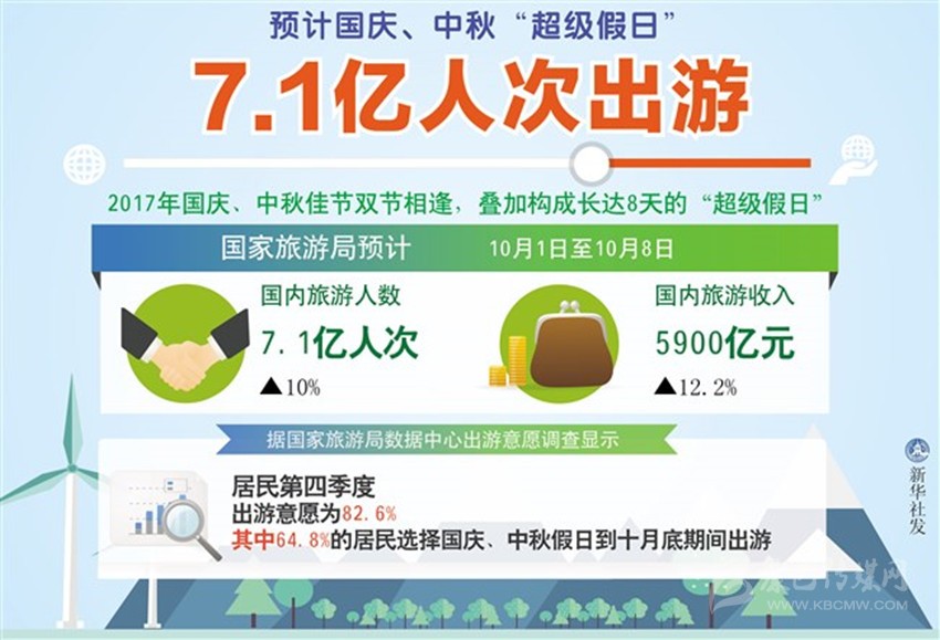 今年國慶、中秋佳節(jié)雙節(jié)相逢,疊加構成長達8天的“超級假日”。國家旅游局預計,10月1日至8日國內旅游人數將達到7.1億人次,國內旅游收入將達到5900億元,較去年同期分別增長10%和12.2%。