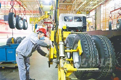 自復(fù)工以來,安徽馬鞍山市經(jīng)開區(qū)內(nèi)的華菱星馬汽車集團一手抓疫情防控,一手抓生產(chǎn)和市場,各項工作順利推進,產(chǎn)能完全恢復(fù)到疫情發(fā)生前水平。圖為工人正在安裝輪胎。