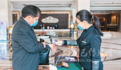 工作人員在內(nèi)蒙古自治區(qū)呼和浩特市一家飯店為進(jìn)店就餐的顧客測量體溫。
