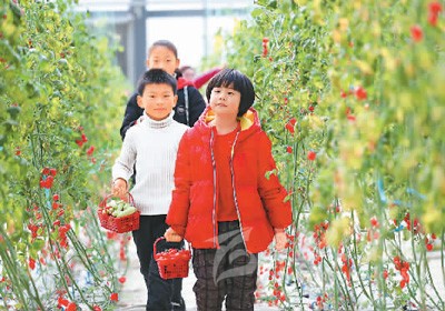 1月3日,浙江省湖州市德清縣洛舍鎮(zhèn)魚(yú)菜共生植物夢(mèng)工廠,游客正在采摘新鮮的小番茄。
