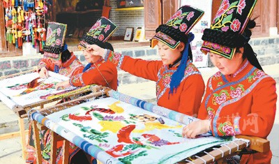 3月27日,繡娘正在陜西省漢中市寧強縣青木川羌繡傳習(xí)基地生產(chǎn)羌繡繡品。