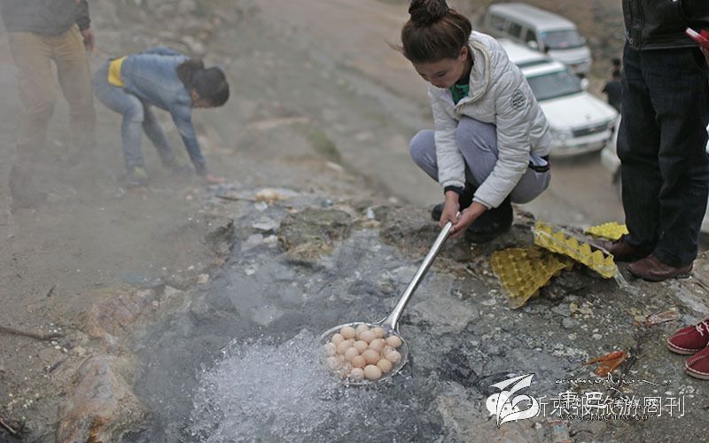 這里的溫泉很有趣,在石頭里能傳來水燒開后的聲響,而在露天的溫泉眼,水花噴涌,溫泉的溫度很高,據(jù)說有90度,我們拿了好多雞蛋,用漏勺盛著,放進去煮,幾分鐘后,就熟了。蛋黃完全凝固了,可見溫度是很高的。
