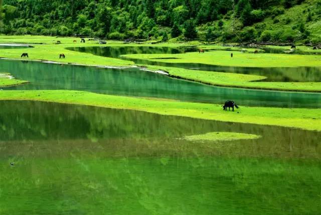 被原始森林和草甸環(huán)抱的五須海,當(dāng)?shù)厝擞鳛椤跋膳釆y的明鏡”,湖水碧綠透亮,將周圍的山水和天空全映照在湖面,幽靜的像一幅畫。從夏到秋周圍百花盛開,古樹盤根錯(cuò)節(jié)、藤枝攀沿纏繞,杜鵑樹伸向湖面,仿佛進(jìn)入原始古樸的仙境。