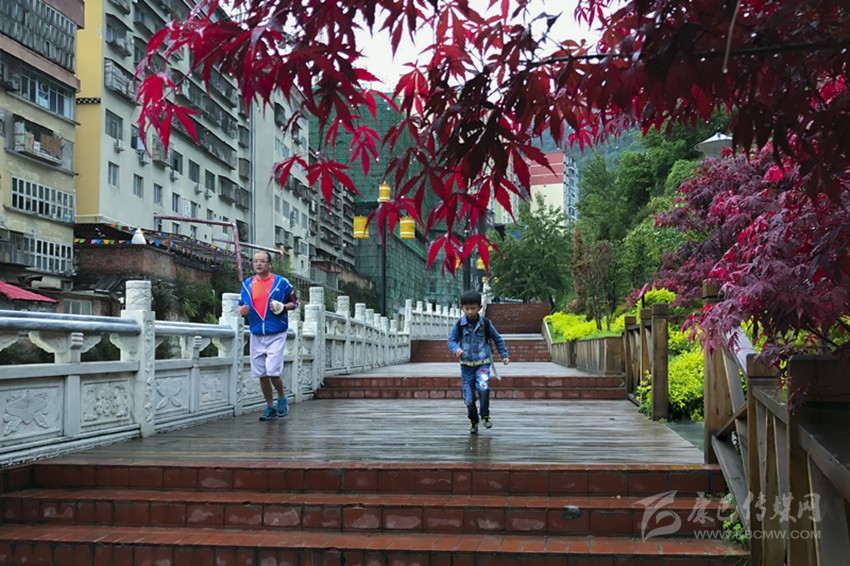 圖為晨練的市民和上學(xué)的小朋友愉快地通過(guò)阿里布果步游道。(馮光福 攝影報(bào)道)