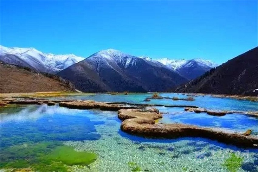 泉華灘海拔約4000米,屬于高山河谷草甸地貌。東南面就是貢嘎山,這里是觀看“蜀山之王”的絕佳位置。它因一種含有大量化學(xué)物質(zhì)的泉水在地表產(chǎn)生化學(xué)沉淀而成,從另一個山頭傾斜下來大片的白色鈣化土,延伸到谷底后便變化出四層五彩的鈣化池。每個階地上有十幾個大小不同、形態(tài)各異的五色彩池,水深40-70厘米,彩池里水草相依,石花點點,疑為瑤池降臨人間!