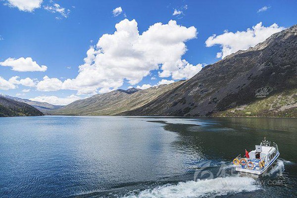 坐船游湖是感受木格措風(fēng)光最好的方式。坐在船艙看在那煙波浩渺波光粼粼的湖面,使人感到一種置身世外桃源般的感受,陶醉在這沒有粉飾的質(zhì)樸圣潔的美中,忍不住想放聲高歌,又怕破壞了這和諧的氣氛。