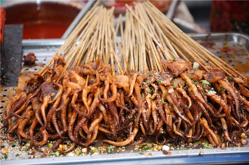 作為一個四川人,對于麻辣味的食物毫無抵抗力,在康定后街林立的商鋪中,記者一眼就相中了“深海魷魚花”這家店。看著泛著紅油的魷魚花靜靜地躺在紅椒和芹菜間,記者咽了咽口水,向老板買了一份兒?!罢媸羌兗兊拇ㄎ秲簺]錯了,又麻又辣的?!庇浾邔习逭f。老板回答到:“魷魚花最講究的就是刀法了,要切得好看。雖然在顧客看來都差不多樣子,但是我每次都要經(jīng)過細細斟酌再一刀一刀的切,爭取多弄幾種樣式,現(xiàn)在我的??蛡円矔毤毜乜季课仪械聂滛~花了。以前我只賣烤魷魚,只是在家里偶爾會給我兒子做魷魚花,后來看我兒子喜歡吃,才開始慢慢地賣魷魚花,沒想到還是很受歡迎。這次美食節(jié),我發(fā)現(xiàn)沒有人做魷魚花,所以我就帶著我兒子喜歡的魷魚花來參加這次美食節(jié)了?!崩习逍χ浾哒f。