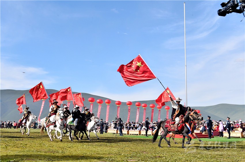 開幕式現(xiàn)場,國旗方隊、民兵方隊、中國娃方隊、彩旗方隊、黨政方隊、色曲泥曲方隊和服飾方隊等方隊的代表們身著節(jié)日盛裝,邁著時代的步伐,和著鼓號的節(jié)拍,展現(xiàn)了色達(dá)人民喜迎州慶、奮發(fā)向上的精神風(fēng)貌;上千名騎手手擎國旗迎風(fēng)馳騁,讓草原熠熠生輝,表達(dá)了色達(dá)人民感恩祖國感恩中國共產(chǎn)黨,精心呵護(hù)來之不易的和諧與穩(wěn)定。