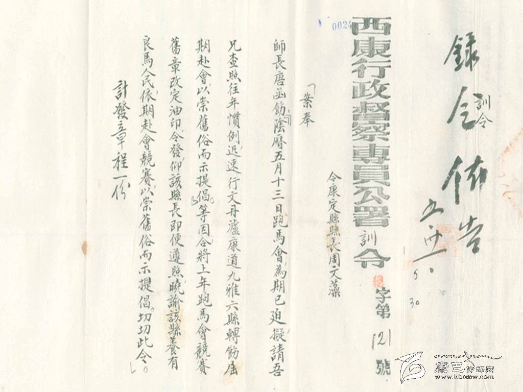 康定城各民族雜居,各種民族文化相融,形成了康定特有的民俗、風(fēng)俗?,F(xiàn)在已經(jīng)不可能見到的“郭達(dá)將軍廟會”和每年“四月八轉(zhuǎn)山會”期間在康定城郊舉辦的“賽馬會”,這些屬于康定特有的民俗風(fēng)情,在民國時期曾經(jīng)盛況空前。舉辦“郭達(dá)將軍廟會”,警察要出來維持秩序。這份賽馬簡章特指1940年“四月八轉(zhuǎn)山會”時的一次賽馬。據(jù)《甘孜州志》記載:在1940年的5月,由于有“康定、瀘定、九龍、丹巴、道孚、乾寧”騎手參加賽馬活動,才制定了這份“新簡章”。