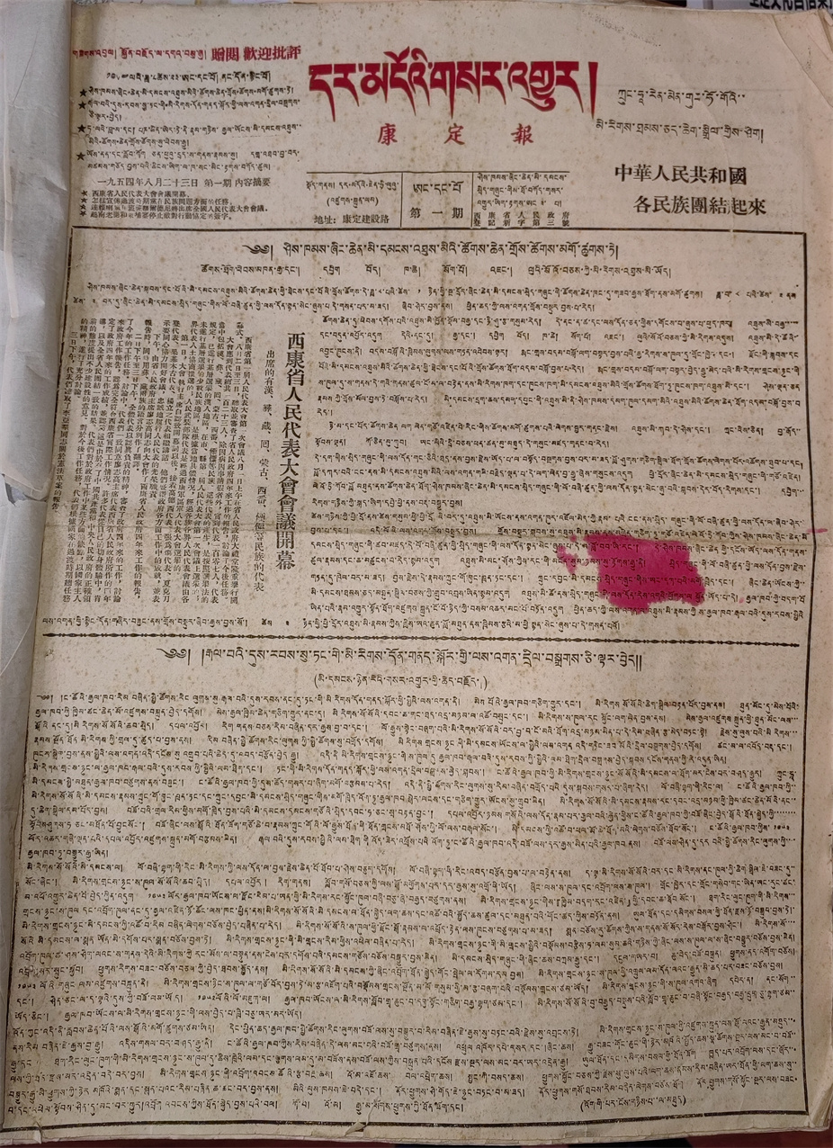 1954年12月以前出版的《康定報》,刊期不定,版數(shù)不定,刊期長時達(dá)17天一期報紙,短時7天一期報紙;版面有時是對開四版,有時是對開二版。1954年12月10日以后,基本上能十天出一期報紙,1955年1月以后改為周刊。西康省與四川省合并后,經(jīng)四川省委宣傳部批準(zhǔn),《康定報》從1956年1月起,正式改為周五刊。改刊初期,每期報紙每個版都用藏、漢文對照排版。后來又改為藏、漢文分別組版,即一、二、三版為藏文,四版為漢文。