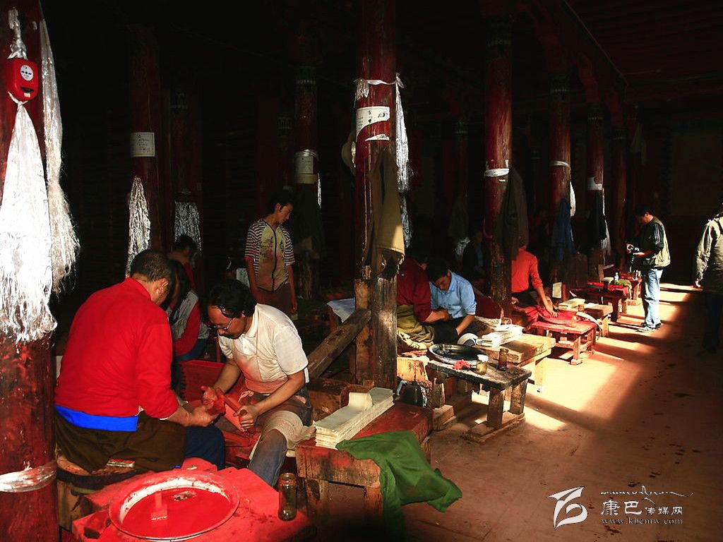 德格印經(jīng)院的各種傳統(tǒng)產(chǎn)業(yè),當(dāng)?shù)鼐用竦纳a(chǎn)勞動(dòng)都立足于當(dāng)?shù)刈匀画h(huán)境資源,并且全面地支持著傳統(tǒng)印刷技術(shù)系統(tǒng)的各階段。包括“瑞香狼毒”的草根造紙方法,均與德格地區(qū)的傳統(tǒng)產(chǎn)業(yè)有關(guān)。藏紙是當(dāng)?shù)鼐用裼脗鹘y(tǒng)手工方式制造的印刷紙,是用一種叫“阿交如交”(瑞香狼毒)草本植物根須為原料制造而成。這種紙的顏色微黃,質(zhì)地較粗厚,但纖維柔軟,不易脆,吸水性強(qiáng),同時(shí)還具有防蟲蛀、防鼠咬,久藏不壞的特點(diǎn)。印經(jīng)院的印刷用色通常分為紅版和墨版兩種。木刻印版的刻制工作更為艱辛,印經(jīng)院選聘藏文知識高深淵博的名士將所要刻制的圖書進(jìn)行嚴(yán)格細(xì)致的三級審校,才可由聘請的藏文書法技藝精深的學(xué)者嚴(yán)格按照藏文書法正楷要求開始橫版書寫工作,他們將圖文描繪在半透明的薄紙上反貼在板面上??坦円罁?jù)紙上的色差進(jìn)行刻制,刻完后編師們在清樣上還要進(jìn)行三校,版面改動(dòng)較多的必須進(jìn)行重刻,一般的進(jìn)行補(bǔ)刻。直至完全準(zhǔn)確無誤時(shí)將印版放在酥油里浸泡一天后,取出曬干,再用一種名叫“蘇巴”的植物根熬水洗凈曬干,至此一塊印版的制作才算全部完成,可入庫上架和進(jìn)行印刷。通常情況下,技藝嫻熟的一名工人每天完成一張書版的單面刻制,畫版刻制工作量更大。雕刻技工都是來自本地及周邊地區(qū)的民間藝人。