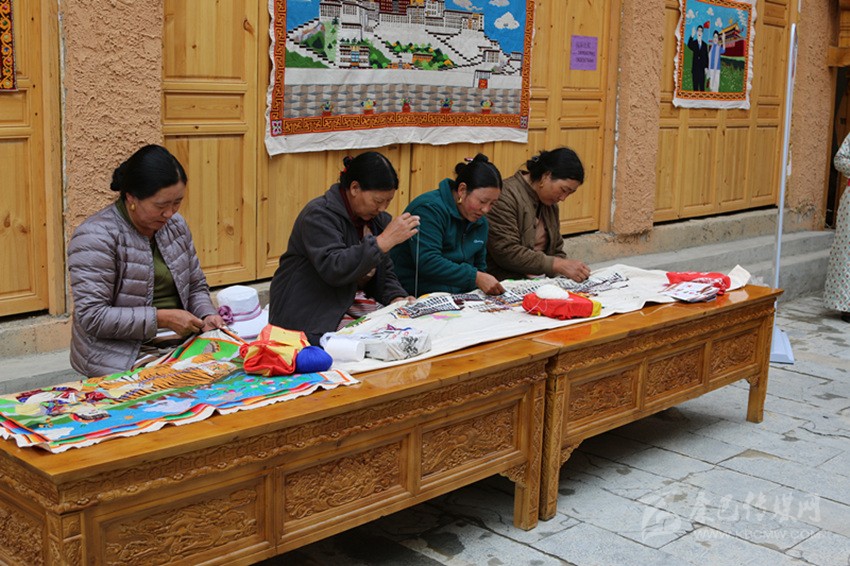 在藏繡展點,5名農(nóng)牧民婦女正在合繡一幅藏族建筑刺繡作品。“我從16歲開始跟著父親學藏繡,傳到我這已經(jīng)是第四代了。除了‘六長壽’、度母像等傳統(tǒng)圖案,今年是新中國成立70周年,我還繡了一幅天安門作品?!?7歲的傳承人達打介紹道。