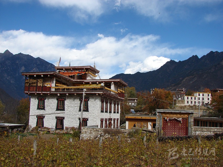 當翻過一處斷崖,眼前豁然開朗。一大片平整的田地出現(xiàn)在我們的面前。田地里,一棟棟白色的藏房或鶴立雞群,或三五聚集,看似毫無規(guī)律,其實從整個房屋大門的朝向可以看出,在房基的選擇時,對陽光的接納面、風水等都作了充分的考慮。
