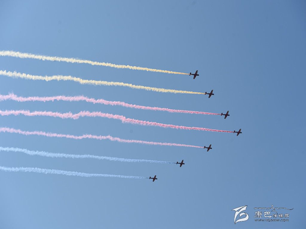 ?。返啦薀?、8道彩煙……絢麗濃艷的彩煙帶成為空中的“吸睛”亮點。