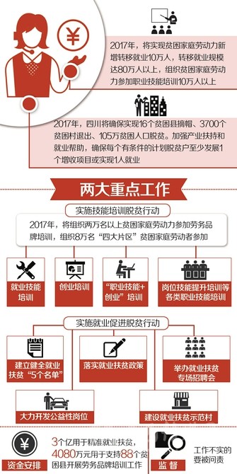 2017年,四川要“確保實現16個貧困縣摘帽、3700個貧困村退出、105萬貧困人口脫貧。加強產業(yè)扶持和就業(yè)幫助,確保每個有條件的計劃脫貧戶至少發(fā)展1個增收項目或實現1人就業(yè)”的目標。