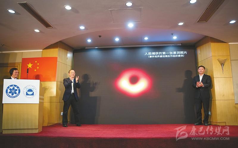 4月10日,中國(guó)科學(xué)院上海天文臺(tái)舉行新聞發(fā)布會(huì),為人類(lèi)史上首張黑洞照片揭幕。新華社記者 金立旺 攝