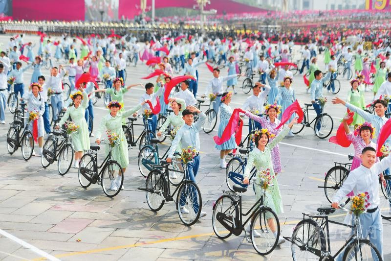 在10月1日上午進(jìn)行的國慶70周年群眾游行中,上百名少男少女騎著自行車從廣場通過。這個主題為“青春萬歲”的場景喚醒了很多人對20世紀(jì)80年代的時代記憶……這是本次群眾游行中的第一個情境式行進(jìn)。