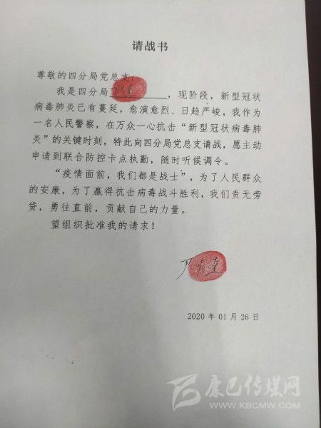 四川新聞網(wǎng)成都1月31日訊(記者 文驥 攝影報(bào)道) “疫情面前,我們都是戰(zhàn)士,為了人民群眾的安康,為了贏得抗擊病毒戰(zhàn)斗勝利,我們責(zé)無(wú)旁貸……”尹彥奎是成都交警四分局的一名黨員交警,1月26日,他向分局黨總支遞交了一份請(qǐng)戰(zhàn)書(shū),還按上了手印。