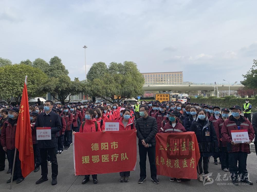 2月9日下午4點(diǎn),四川省第六批援助湖北醫(yī)療隊(duì)300名隊(duì)員在成都雙流機(jī)場集結(jié)完畢,現(xiàn)場舉行了出征儀式。