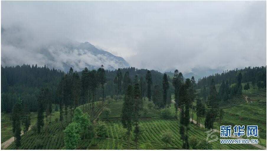 這是4月20日在蘆山縣寶盛鄉(xiāng)拍攝的茶園(無人機照片)。