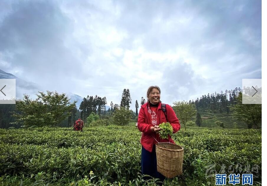 4月20日,在蘆山縣寶盛鄉(xiāng),采茶工人在采摘茶葉(手機拍攝)。