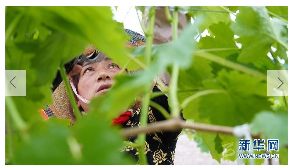 4月20日,在蘆山縣紅星村好農夫家庭農場,工人在固定葡萄藤蔓。這家農場采取“種養(yǎng)循環(huán)”模式,用雞鴨糞給農作物提供肥料。