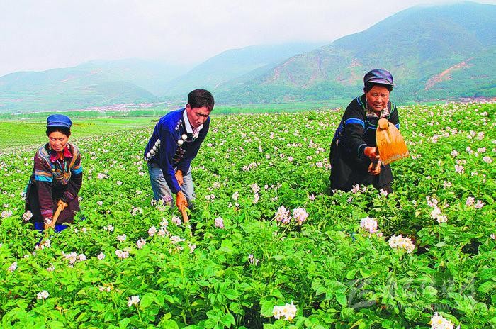 ▲村民在布拖縣拖覺鎮(zhèn)日拍村萬畝馬鈴薯高產(chǎn)示范基地里除草。該縣是四川省優(yōu)勢特色馬鈴薯生產(chǎn)基地。 (攝于2013年6月)
