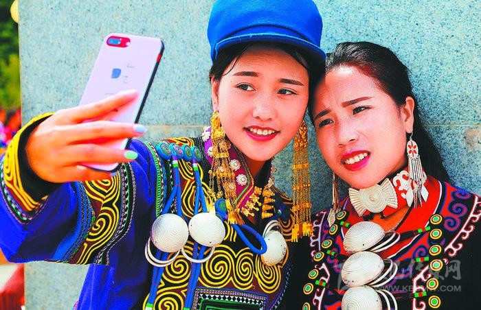 ▲在布拖縣城舉辦的彝族火把節(jié)上,兩位彝族女子用手機自拍留念。(攝于2018年7月)