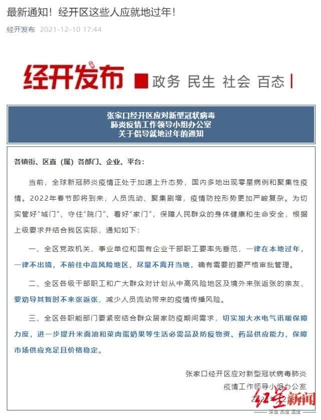 12月9日,河北張家口經(jīng)開區(qū)也發(fā)出通知:全區(qū)黨政機關(guān)職工等就地過年。通知中倡導(dǎo):全區(qū)黨政機關(guān)、事業(yè)單位和國有企業(yè)干部職工要率先垂范,一律在本地過年,一律不出境,不前往中高風險地區(qū),盡量不離開當?shù)?,確有需要的要嚴格審批管理。