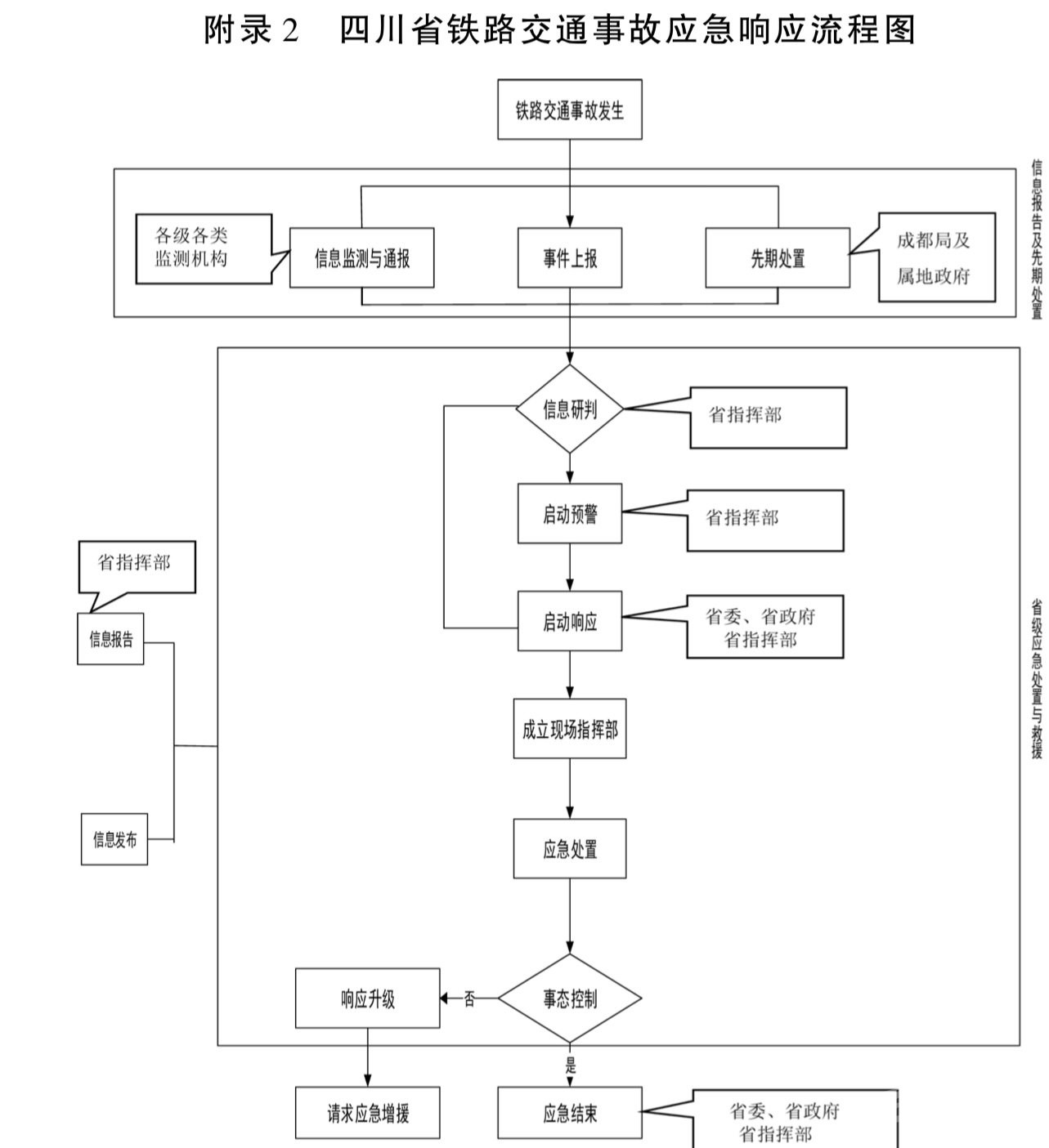 當(dāng)出現(xiàn)重大鐵路交通事故時(shí),實(shí)行分級應(yīng)對。初判發(fā)生特別重大、重大事故,由省級層面負(fù)責(zé)應(yīng)對;初判發(fā)生較大、一般事故,分別由事發(fā)地市(州)和縣(市、區(qū))層面負(fù)責(zé)應(yīng)對,或按照上級組織指揮機(jī)構(gòu)要求具體組織調(diào)度。