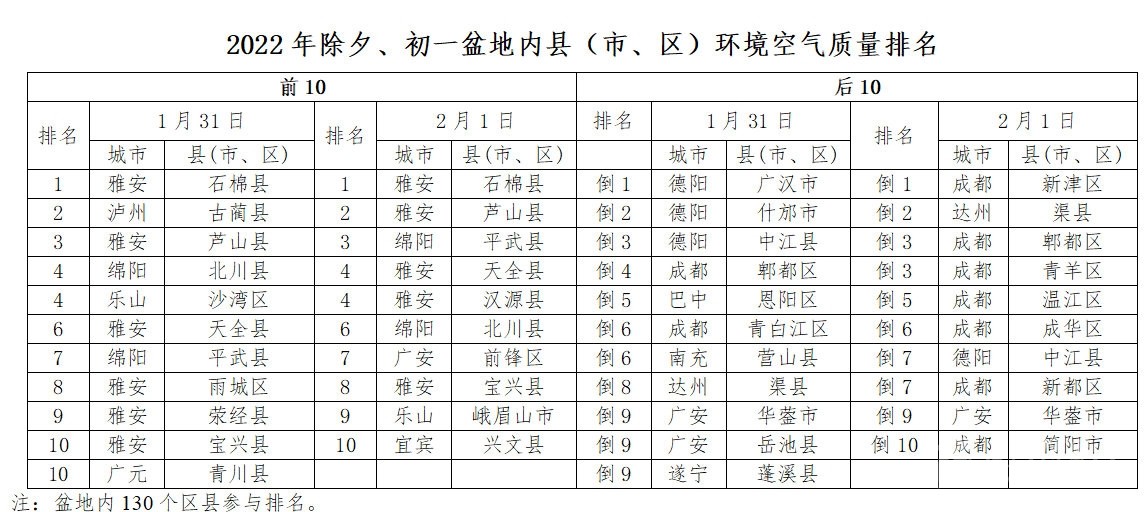 為督促各地加強(qiáng)煙花爆竹燃放管控,四川省生態(tài)環(huán)境廳還對(duì)盆地內(nèi)130個(gè)縣市區(qū)的空氣質(zhì)量進(jìn)行了排名。