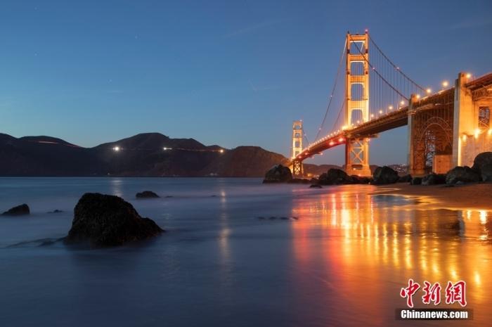當(dāng)?shù)貢r(shí)間10月29日,美國舊金山金門大橋在海浪和夜色的襯托下美如一幅畫。中新社記者 劉關(guān)關(guān) 攝