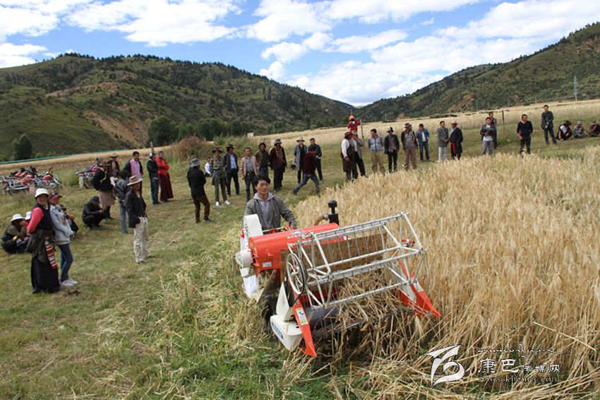9月14日,在海拔3600多米的理塘縣甲洼鄉(xiāng)下依村成熟青稞地里,縣農(nóng)牧和科技局的農(nóng)機手正用小型聯(lián)合收割機示范收割青稞。7個行政村的村支書、村主任在現(xiàn)場觀摩學習。俄曲村支書洛真說:“這個小型聯(lián)合收割機很適合我們高原,這將大大減輕我們的勞動強度,不用再擔心下雨影響搶收。” (葉強平 攝影報道)