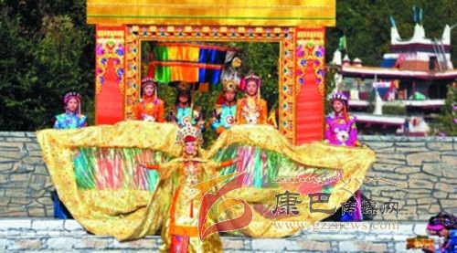 在催人奮進的戰(zhàn)鼓聲中,一群身披甲胄的士兵拿著長劍,背著巨弓走到臺前,在鏗鏘的戰(zhàn)鼓聲中,戰(zhàn)士們做著各種競技動作,模仿武士們互相攻擊的樣子,那矯健的身影展示了遠古時代嘉絨藏族先民們?yōu)榱松媾c自然努力抗爭的場景。過了一會兒音樂一轉(zhuǎn),戰(zhàn)鼓聲漸漸減弱,在鳥雀的陣陣啾啾聲中,一座木門慢慢的開啟,一位身披長袍、頭戴鳳冠的女王在眾多美女的簇擁下,緩緩走下臺階步入舞臺中央,此時,一位手捧托盤的老者來到女王面前單膝下跪,將托盤高舉過頂,并邀請女王品嘗佳肴,女王將中指在酒中蘸了蘸,并曲起中指向四周輕輕彈去,寓意愿將杯中美酒與四方百姓同飲。在女王面前還放置著一個凈水桶,桶中盛滿了清澈的甘泉,桶上橫放著一枝柏樹枝,女王伸出纖纖玉手,拿著柏樹枝在水中蘸了蘸,面向墨爾多神山撒去,寓意向神山祈福。這是此次《美人谷·丹巴》節(jié)目展演中的序曲部分,有著強烈的東女神韻,將遠古時代東女國女王遺風(fēng)展演的淋漓盡致。