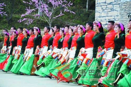 10月26日,在甲居藏寨,處處洋溢著豐收和歡樂的氣氛,人們扶老攜幼,身著節(jié)日的盛裝走到一起,來共同慶祝丹巴嘉絨風(fēng)情節(jié)的順利召開。在一塊空地中,搭建了臨時的舞臺,看臺上,幾座古碉模型傲然挺立,在不遠處,一座古碉矗立在一座小山包上,與古碉模型遙相呼應(yīng)、相映成趣。上午9時40分,當節(jié)目主持人宣布嘉絨風(fēng)情節(jié)正式開始時,一束束搖曳的煙花向空中飛去,在空中炸響后,散發(fā)出五顏六色的煙霧,其中有的還幻化成幾多小小的降落傘,就像多多盛開的鮮花在空中綻放。演出現(xiàn)場前的大地和遠處的小山坡上到處都站滿了熱情的觀眾,合著禮花的爆裂時的響聲,將手中的小紅旗展開,高舉過頭頂,有節(jié)奏的左右搖動,霎時間,整個現(xiàn)場成為了紅色的海洋。