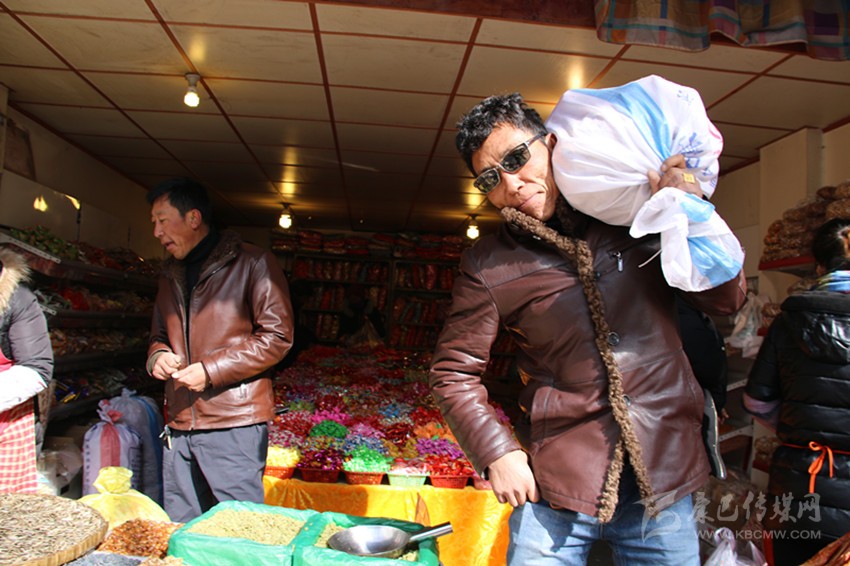 走進(jìn)郭達(dá)橋重康糖果店,洛讓說:“多買點(diǎn)糖果糕點(diǎn),娃娃老婆喜歡?!比缓笳諉吸c(diǎn)貨:花生10斤、瓜子5斤、葡萄干5斤、水果糖5斤、軟糖5斤、炒米糖10斤……一下就指點(diǎn)了八九種糖果糕點(diǎn)??吹搅诉@樣的生意,老板樂開了花。與洛讓大包大攬的氣派不同,長期經(jīng)商的扎西老練地詢價:“老板,我們買這么多,要優(yōu)惠喲?!币环憙r還價之后,洛讓和扎西買了十種糖果,用去1066元,裝滿整整兩編織袋。洛讓把糖果過扛在肩上,對筆者說:“你來試一下,有點(diǎn)分量,你別說,辦年貨也是一種體力活喲?!?/p>