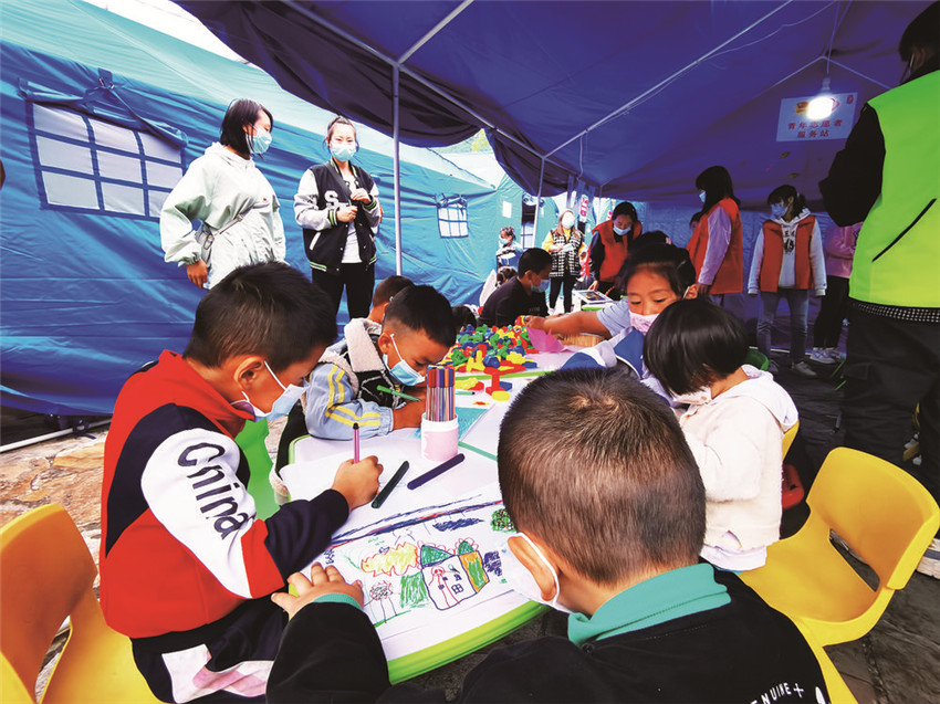 “這頂帳篷中充滿了孩子們的歡聲笑語(yǔ),這在地震災(zāi)區(qū)就是最動(dòng)聽(tīng)的聲音?!惫睬鄨F(tuán)甘孜州委統(tǒng)戰(zhàn)社會(huì)聯(lián)絡(luò)部部長(zhǎng)澤仁娜姆介紹,地震發(fā)生后,團(tuán)州委第一時(shí)間組織3193名志愿者,24支青年突擊隊(duì)參與應(yīng)急志愿者工作,并在磨西鎮(zhèn)貢嘎廣場(chǎng)分配38名志愿者參與后勤保障工作,其中5個(gè)人便成為了“青青兒童樂(lè)園”里的“保育員”,“孩子們可以在這里畫(huà)畫(huà)、做游戲,還能在老師輔導(dǎo)下學(xué)習(xí),他們不安的情緒也得到安撫,臉上的恐懼也逐漸被微笑取代。”