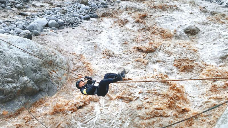 運送帳篷的消防員,沿著Z字形的陡峭山路,螺旋式往目的地進發(fā)。一道道桔紅色身影緩緩穿梭在翠綠的森林之中,汗水濕透了消防員的衣背,一顆顆汗珠沿著頭盔從前額落下。