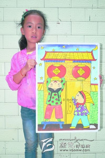 “我和弟弟迎親人”是瀘定縣成武小學二年級學生,周靖蕓同學有感于阿婆家中常有結對認親干部來走訪關心而作的畫。據(jù)小朋友自己說:她畫的房子是她阿婆家,掛燈籠的女孩是自己,拿‘迎親人’條幅的是弟弟,畫星星是認親干部有時晚上也會到她阿婆家。(王可富 攝影報道)