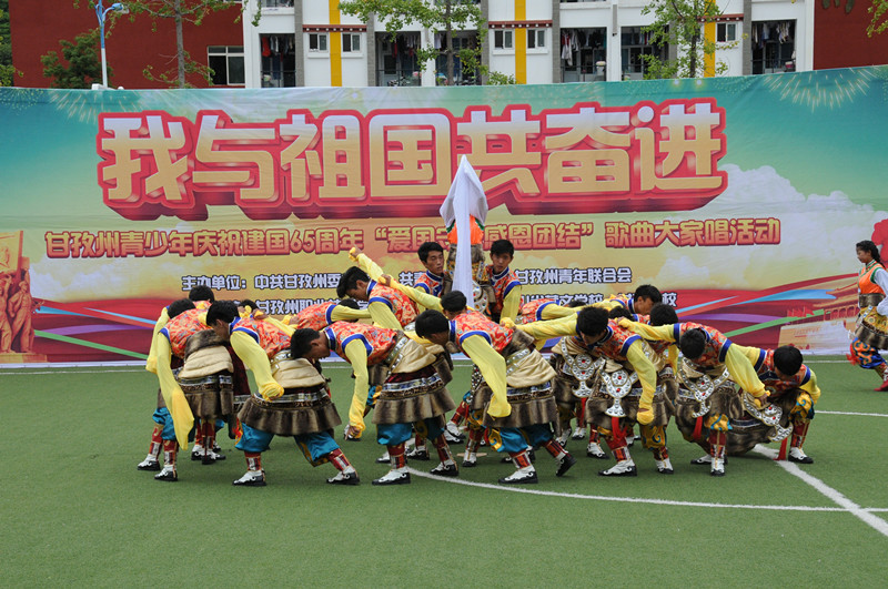 活動(dòng)中,同學(xué)們先后演唱了《黃河頌》、《我愛(ài)您,中國(guó)!》、《夢(mèng)圓中國(guó)》等多首紅色經(jīng)典歌曲。你方唱罷我登場(chǎng),現(xiàn)場(chǎng)氣氛熱烈,高潮迭起。優(yōu)美的歌聲唱出了我青少年的愛(ài)國(guó)情懷,一面面飄揚(yáng)的紅旗表達(dá)著對(duì)祖國(guó)的深情祝福。來(lái)自州職業(yè)技術(shù)學(xué)校、四川民族學(xué)院、省藏校、甘孜衛(wèi)校、州青聯(lián)委員以及我州著名歌手共1000多人放聲高歌,共同慶祝新中國(guó)成立65周年華誕。
