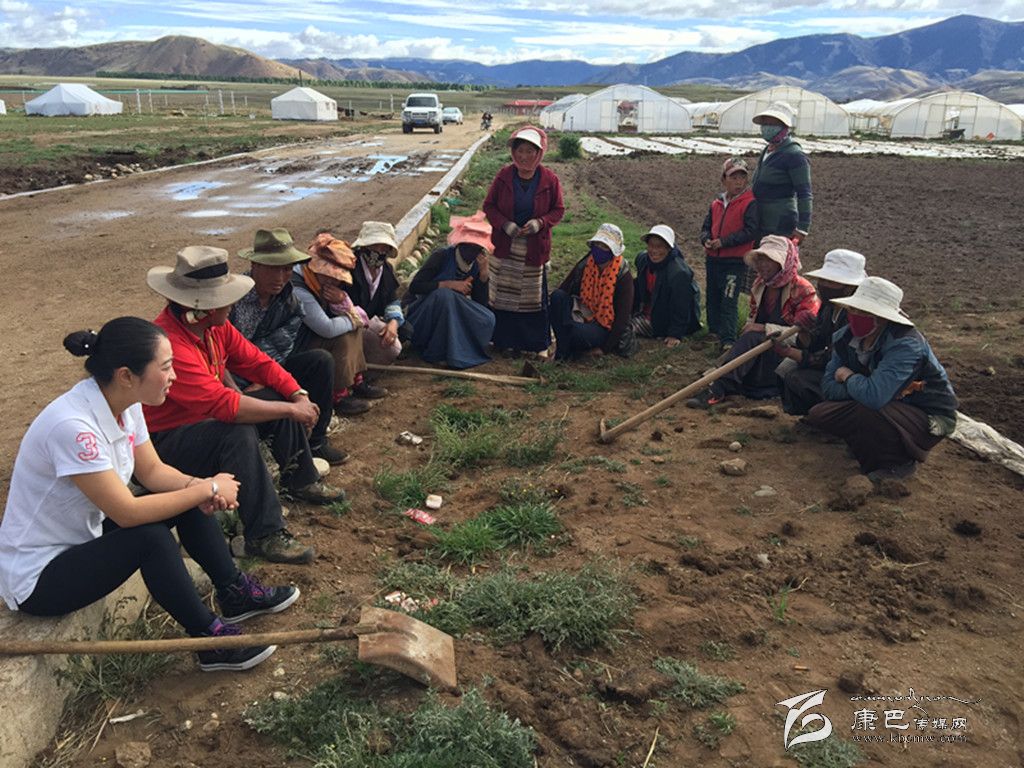 鄉(xiāng)黨委書記使朗擁忠(左一)了解村民在圣地農莊打工及學習蔬菜種植情況︒ 葉強平 攝