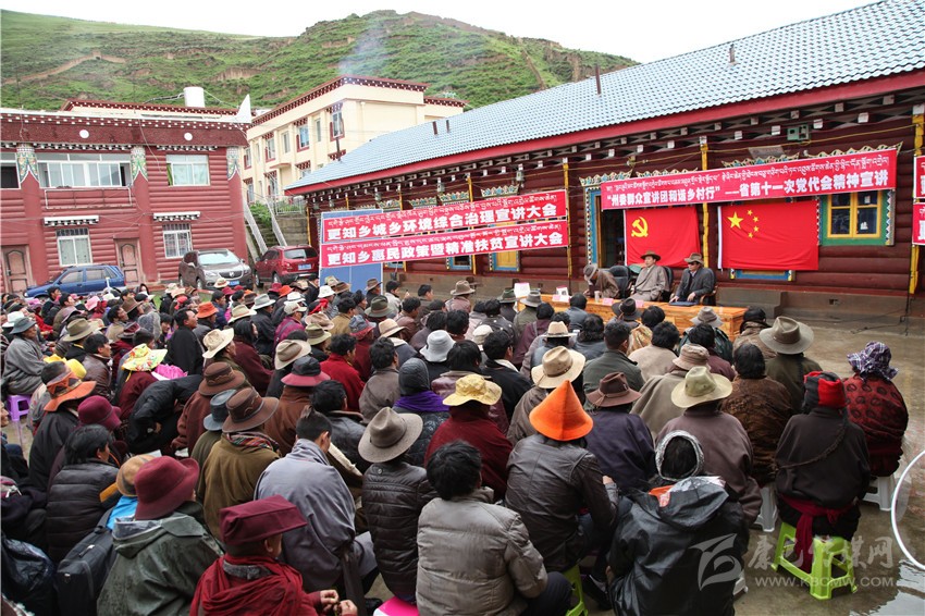 上午10時(shí)30分,宣講在濛濛細(xì)雨中開始了。只見村民們?nèi)纪χ毖鼦U端坐在雨中,一雙雙渴望的眼睛聚焦在宣講臺(tái)上;宣講員松吉尼瑪用生動(dòng)的例子、經(jīng)典的藏族諺語講述了黨的政策和省第十一次黨代會(huì)精神,生動(dòng)感人的宣講讓現(xiàn)場(chǎng)400余名村民、寺廟僧尼和各級(jí)干部滿意的笑聲瞬間蓋過了打著持久戰(zhàn)的雨聲。