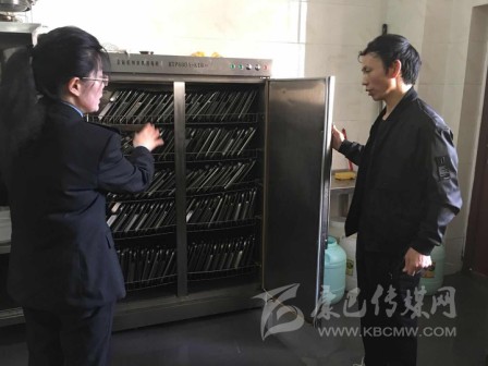 執(zhí)法人員檢查餐飲具消毒情況。