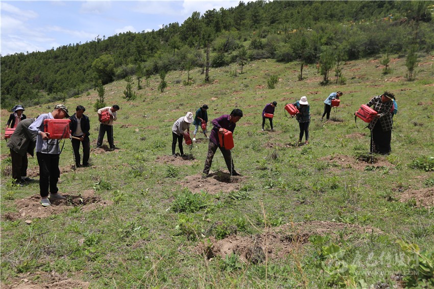 鄉(xiāng)城縣熱麥村群眾在為栽植的毛桃樹澆水。